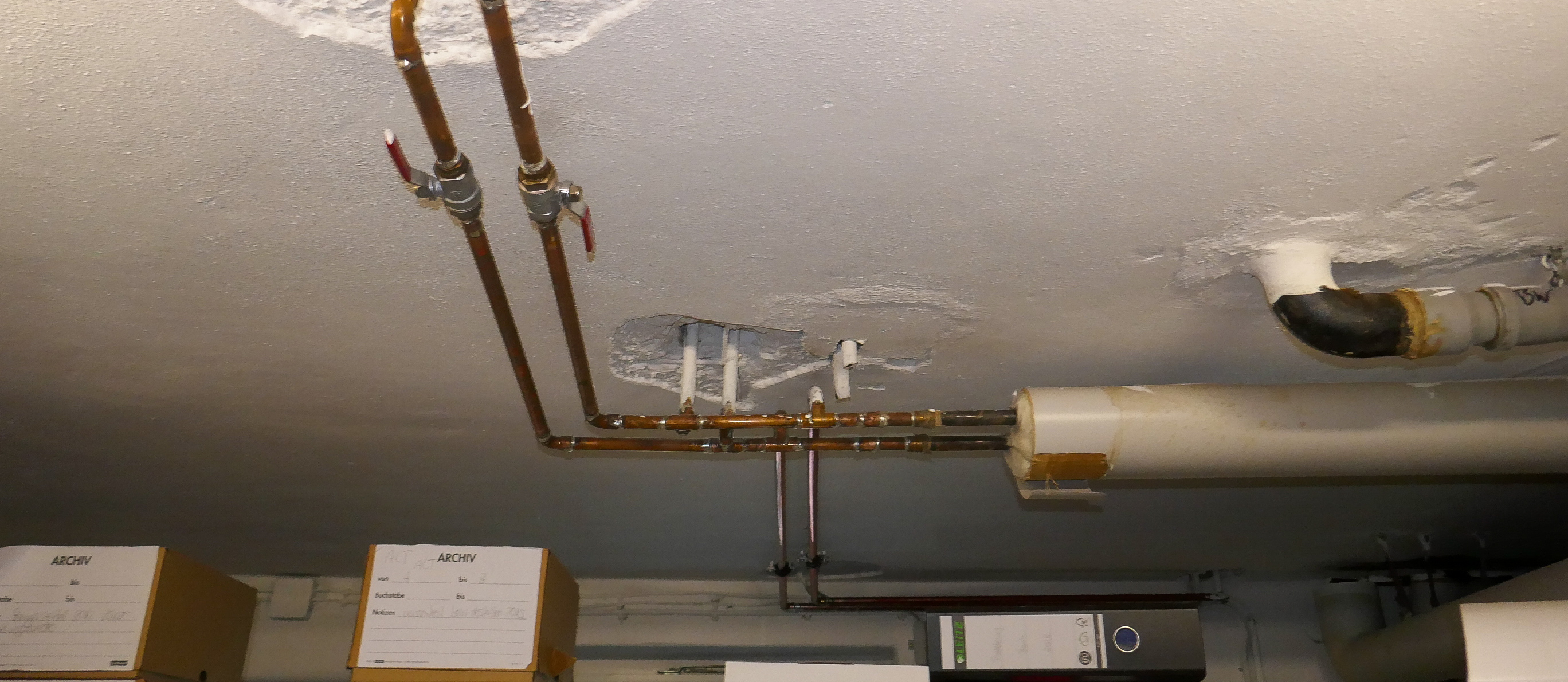 Warum wurden diese Heizungsleitungen im Keller des Hauses nach einer Reparatur nicht gedämmt, obwohl dieses nach dem Gebäudeenergiegesetz(GEG) gesetzlich vorgeschrieben ist? Bei der Kaufberatung versuchen wir Sie möglichst umfassend, auch über den energetischen Zustand der Immobilie zu unterrichten.