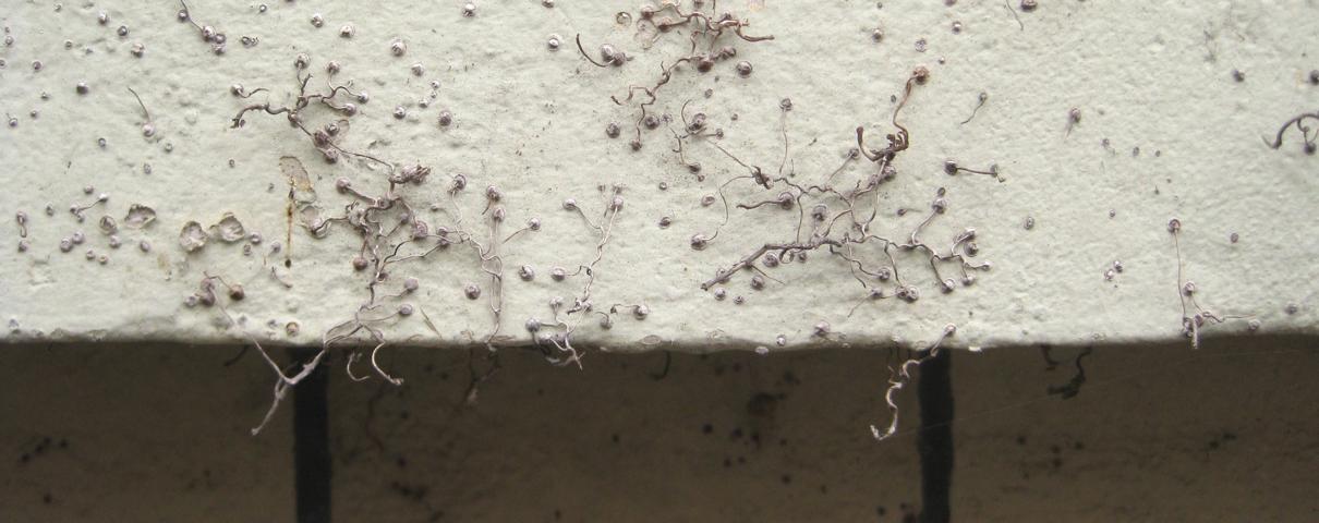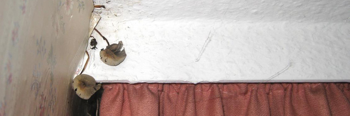Biotop im Schlafzimmer. Nach der Durchfeuchtung einer Holzbalkendecke waren diese Pilze hinter der Tapete hervor gewachsen. Das Wasser bereitet den Nährboden für die Pilze, die ein gewisses Mindestmaß an Feuchtigkeit zum Überleben benötigen. Die Ursache für die Feuchtigkeit bei dem Reihenhaus in Hemmingen war nur ein fehlender Dachziegel.