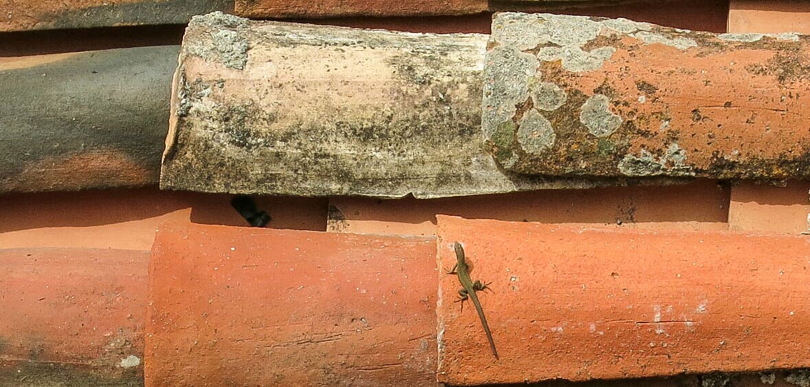 Bei Algen, Flechten und Moose auf Dachziegeln, wie hier oben rechts, wird häufig eine Schädigung des Ziegels vermutet. Tatsächlich ist die Langlebigkeit des Materials dadurch nicht beeinträchtigt.