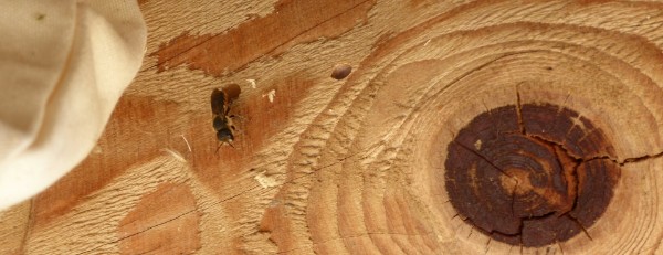 Holzschädlingsbefall in der Holzverschalung der Außenwand dieses Fachwerkhauses in der Nähe von Celle. Das frische Holzmehl war in dem Spinnengewebe unterhalb des Lochs hängengeblieben. Hier war der Hauspreis letztlich ausschlaggebend für die Kaufentscheidung.